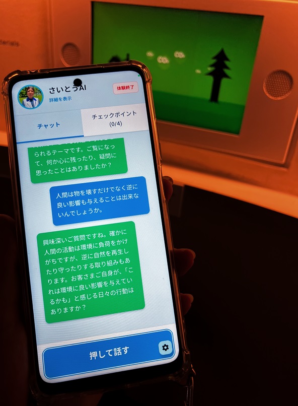 展示フロアでは、専用のスマートフォンを持ち、常設展示を自由に巡りながらAI分身コミュニケーターと対話を行います。展示の前に立ったことを伝えると、来館者の興味や視点に合わせて話題を展開してくれます。
