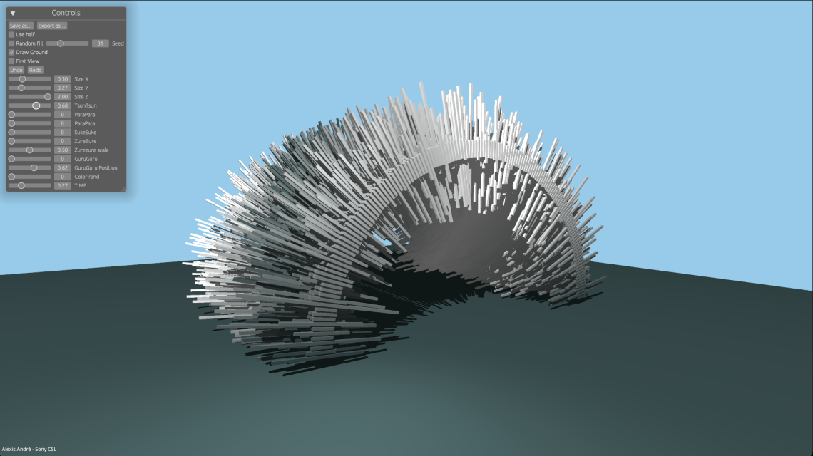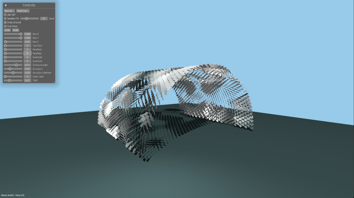 左上にあるスライダーは「ぱらぱら」「つんつん」「すけすけ」等のオノマトペをパラメーターにしている。このスライダーの操作で各オトマノペが調整され(この事例ではドーム状に配置された粒子のふるまいが変化し)感覚的な設計意図を共有可能なビジュアルで示すことができる